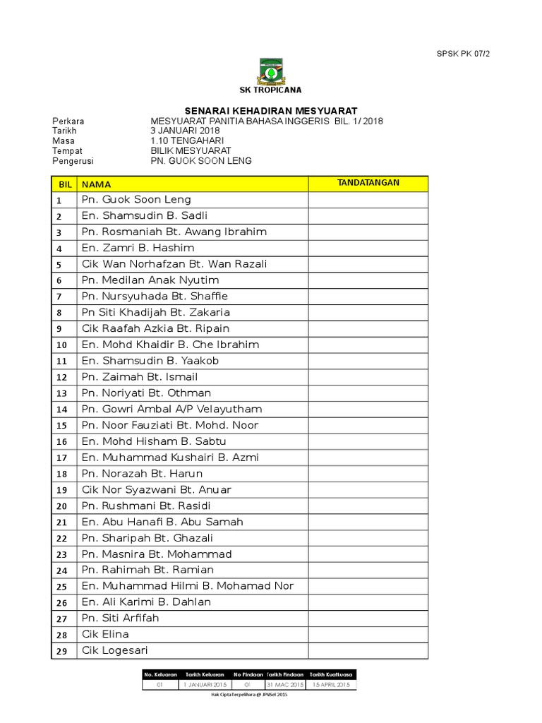 Related : Contoh Senarai Kehadiran Mesyuarat : Borang kehadiran tahun 6 2015 : Bilik mesyuarat rafflesia, tingkat 13, blok b kompleks kerja raya, kkr..