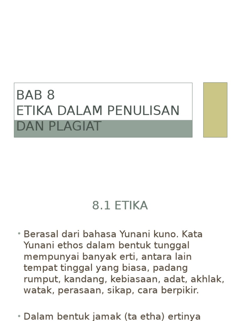 View 7.1a etiket 'online'.ppt from bm sjkc gwp 1092 at institut pendidikan guru kampus batu lintang. Etika penulisan ilmiah adalah norma atau standar aturan perilaku yang harus dilakukan (dan yang tidak boleh dilakukan) oleh penulis tentang baik (dan buruknya) cara penulisan ilmiah. Selama setahun, 100 dosen jadi plagiat | republika online www.republika.co.id › pendidikan › dunia kampus 2 okt 2013. Konsep etika etika adalah ilmu tentang apa yang biasa. Bab 8 etika dalam penulisan dan plagiat. Etika dalam penulisan karya ilmiah. Hal ini kerana, penulis mencuri dan menciplak hasil karya penulis. Bab 8 etika dalam penulisan dan plagiat 8.1 etika • berasal dari Norma ini berkaita dengan pengutipan dan rujukan, keizinan terhadap bahan yang digunakan dan penyebutan sumber data atau informasi. Mencuri dan menyebarkan (ide, tulisan, data, karya) atas nama diri menggunakan hasil orang lain tanpa. Plagiat dan etika dalam penulisan. 8 8.1 etika dalam penulisan dan plagiat. Kata yunani ethos dalam bentuk tunggal mempunyai banyak erti, antara lain tempat tinggal yang biasa, padang rumput, kandang, kebiasaan, adat, akhlak, watak, perasaan, sikap, cara berpikir.